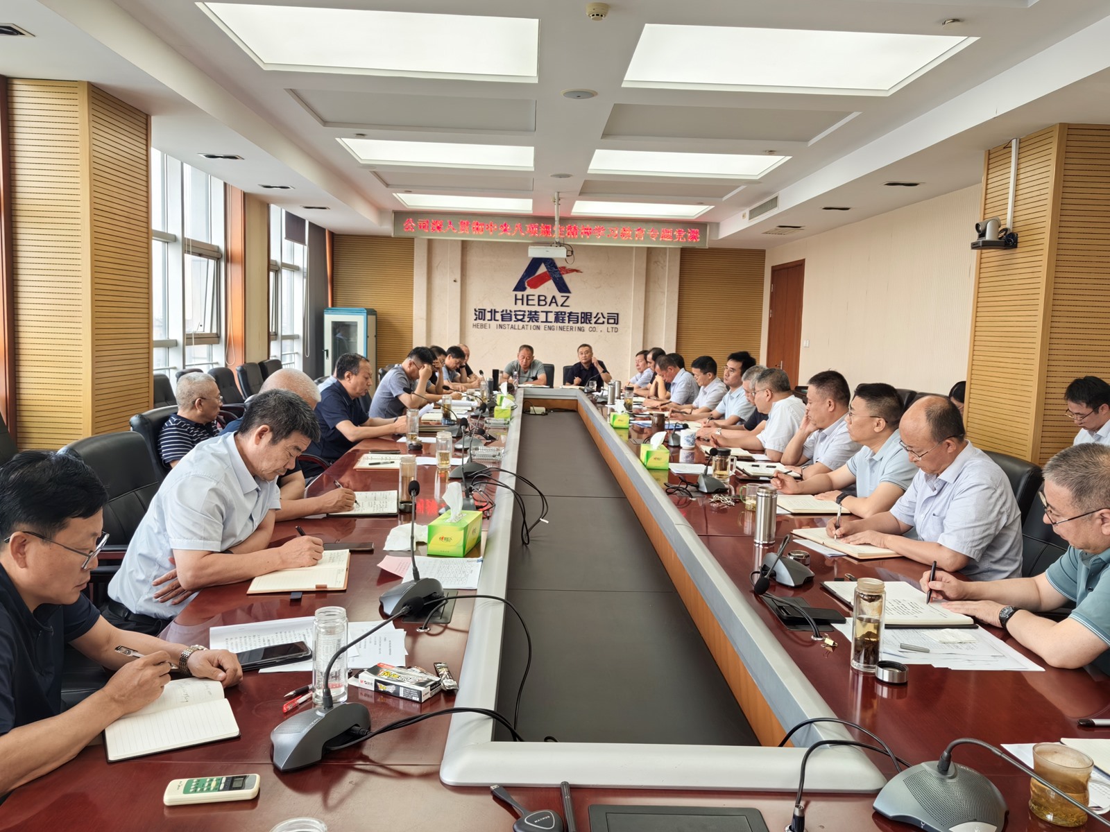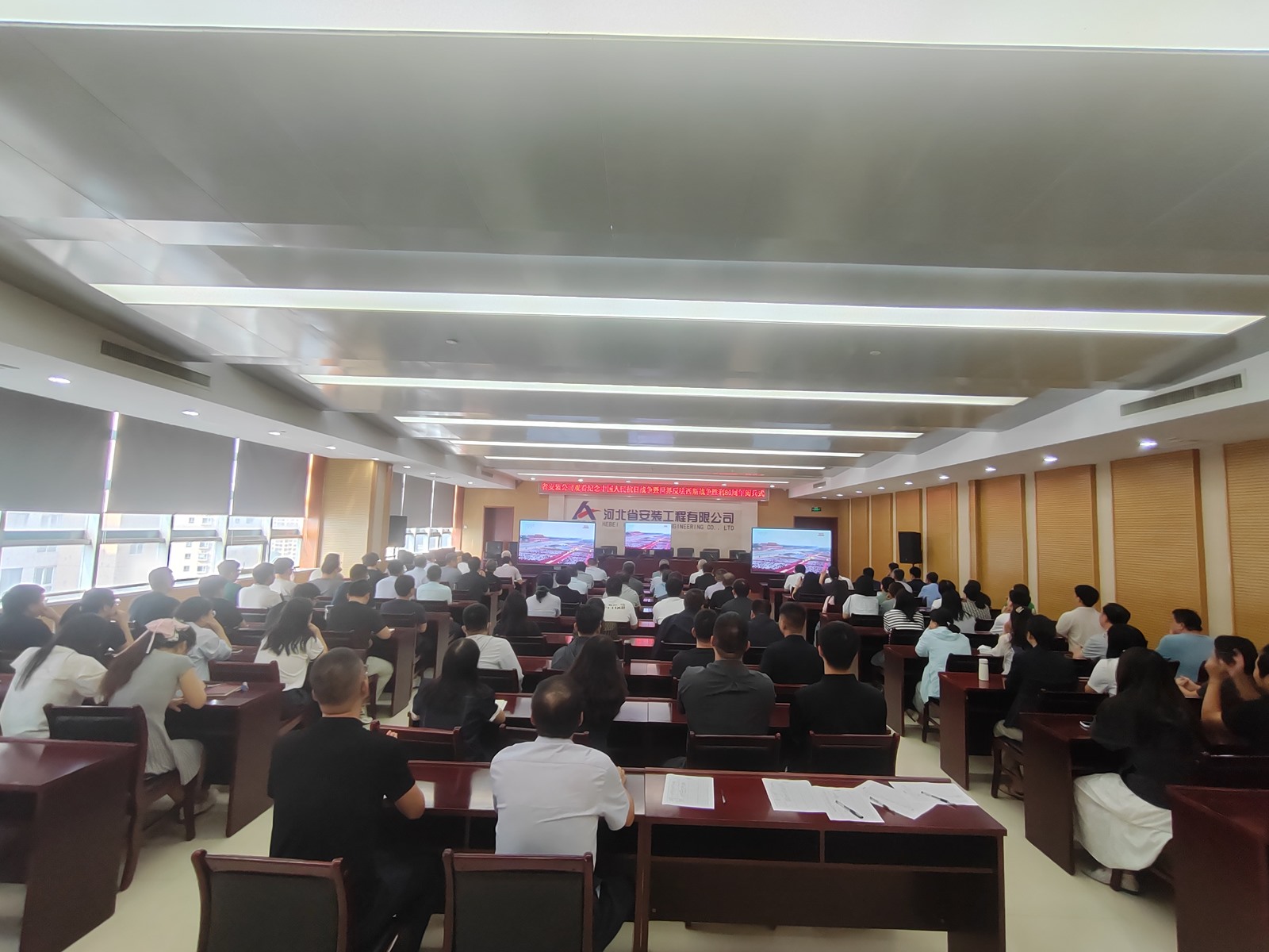 2025年9月3日,為紀念中國人民抗日戰(zhàn)爭暨世界反法西斯戰(zhàn)爭勝利80周年,河北省安裝工程有限公司積極組織職工集中觀看閱兵盛況直播。公司機關(guān)及各分公司、項目部共計2000余人通過多種方式同步參與,共同回顧歷史、緬懷先烈、展望未來。上午9時,習(xí)近平總書記發(fā)表重要講話,9時19分大閱兵正式開始,公司機關(guān)及各分公司、項目部會議室座無虛席,職工們們整齊地坐在屏幕前,神情莊重地注視著電視畫面。在閱兵式過程中,